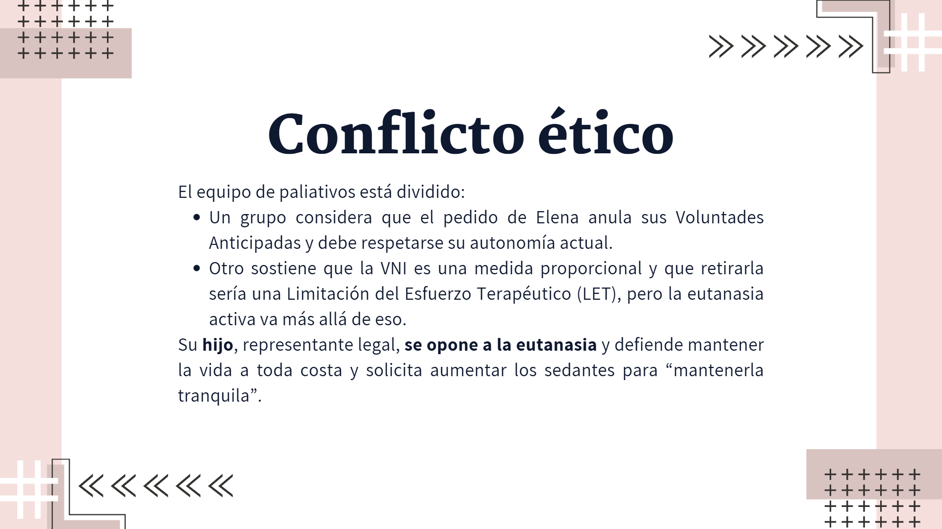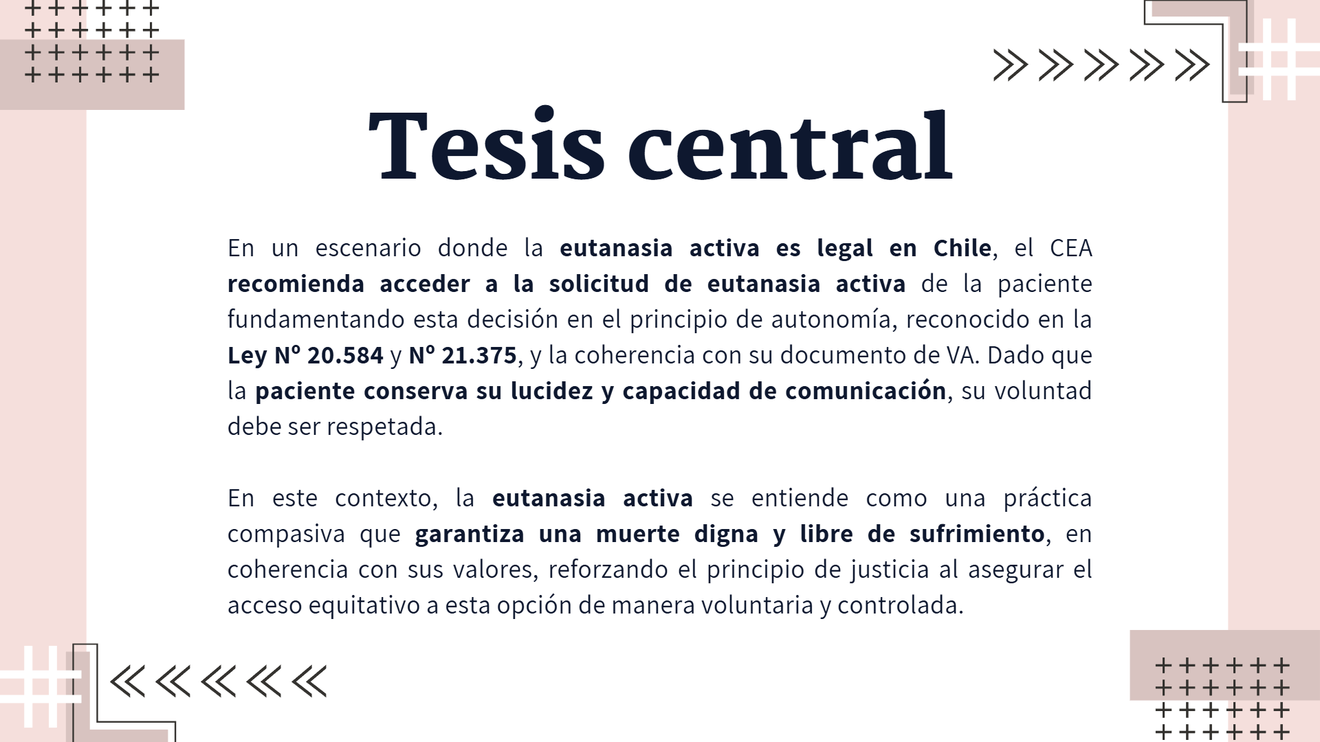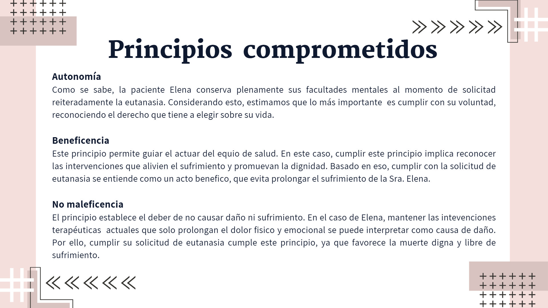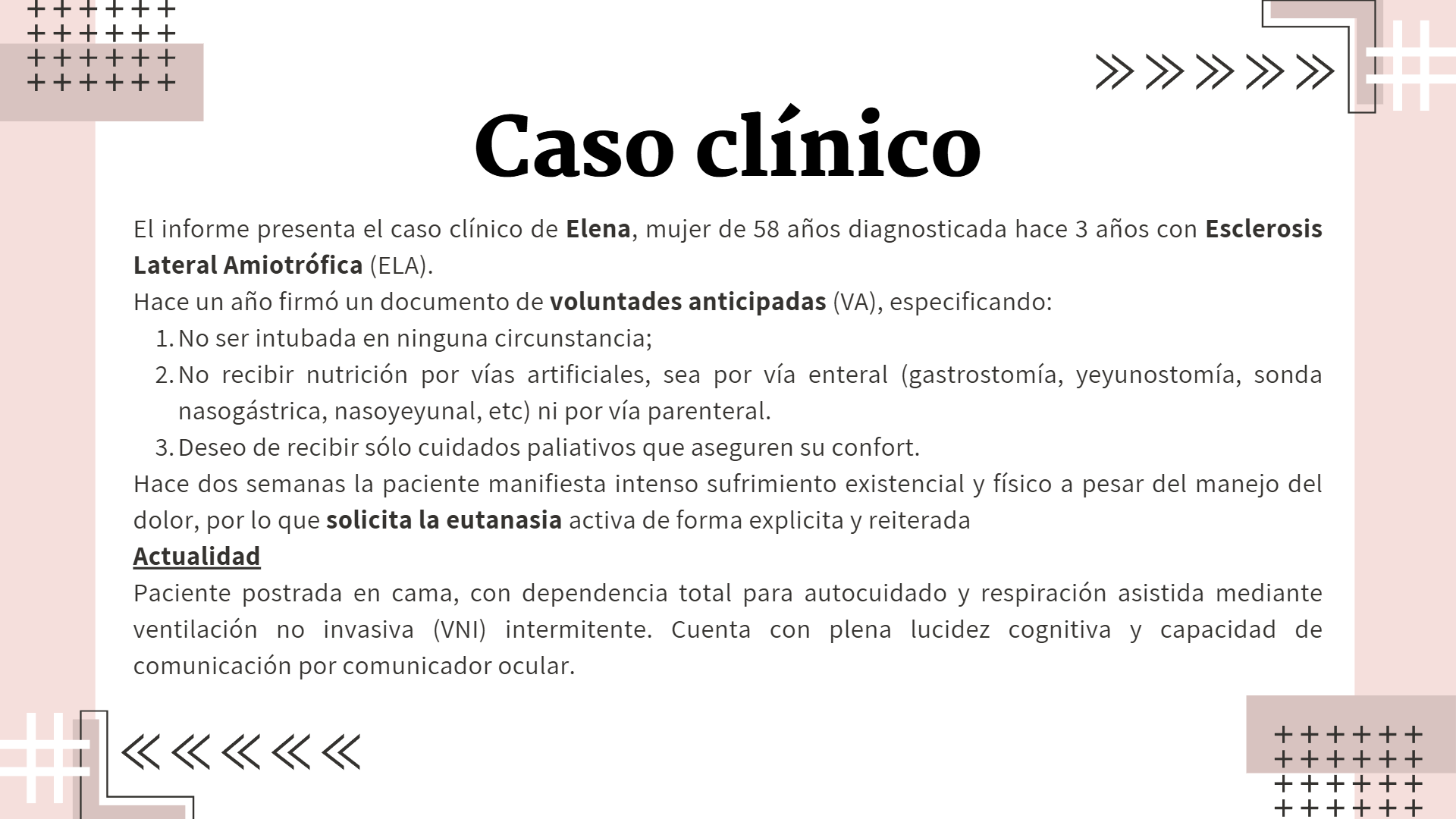 En la siguiente presentación desarrollamos un análisis crítico del caso asignado de la Sra. Elena, el cual, estaba centrado en el contexto de la eutanasia. La presentación tuvo como propósito exponer nuestra tesis central, reflexionando sobre los aspectos éticos, legales y clínicos involucrados, así como las posibles implicancias en la toma de decisiones profesionales.